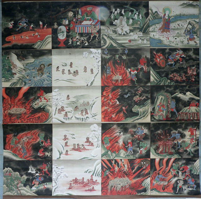 下4段は向かって右2列8つが熱地獄、3列目が寒地獄、4列目(左端)が増、各大地獄に付属する小地獄の例です。
