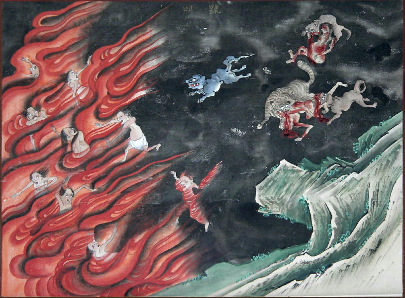 叫喚地獄とは、衆合の下にあり。縦広前に同じ。極卒悪声を出して弓箭をもて罪人をいる。又鉄の棒を以て頭を打て、熱鉄の地を走らしむ。或は熱鉄のいりだな(煎架)にうちかえしうちかえし此の罪人をあぶる。或は口を開けてわける銅の湯を入れば、五臓やけて下より直に出づ。-顕謗法鈔-