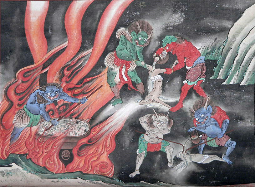大焦熱地獄とは、焦熱の下にあり。縦広前の如し。前の六つの地獄の一切の諸苦に十倍して重く受くるなり。-顕謗法鈔-