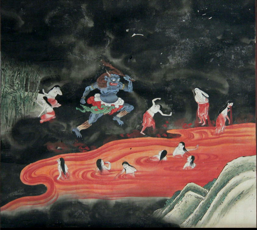 血の池地獄 罪ある女性(産褥などで死亡した場合等も)は死んでここに堕ちるとされる。 血の池地獄とは、死神達に体の皮を剥がれた後、沸騰する真っ赤な血の池の中へ突き落とされ、鞭や棍棒で死ぬまで叩き付けられる。 教典には現れないが女性にとっては地獄の中でもっとも恐ろしい場所。
