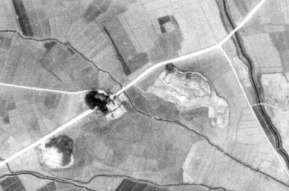 下は1948年米軍撮影の写真です。 中央わずか右、ゆるいS字カーブの下にあるいびつな形をした山。畑の段が等高線の様にも見えます。何かの形に似ていませんか? 左下(南西)方向に小さい丘が3つ並んでいます。一番左下の形は他の写真や地図では方形に見えるものがあります。