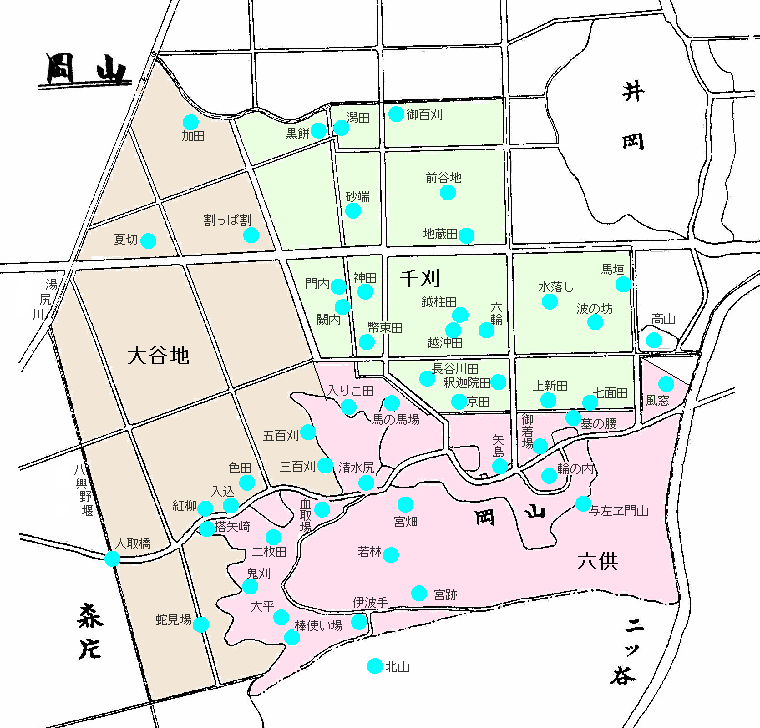 | 38 | | 前谷地 | まえやち | 田 | 井岡山裏から砂端まで続く凹地 | 千刈では一番の湿地帯で牛馬の利用が遅れた田である。 |