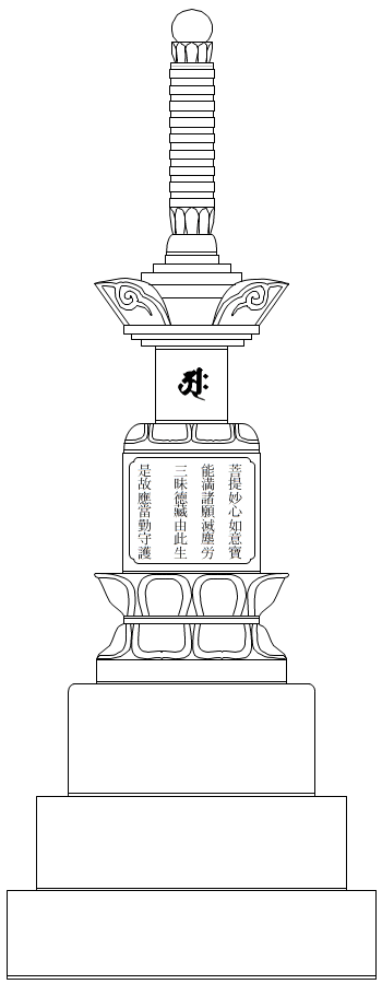 この七宝塔の四方は、如来の形相である。 つまり、その四方には、如来がおられるのである。 宝篋印塔とは、如来の金剛・全身舎利の妙宝蔵の宝塔のことである。」