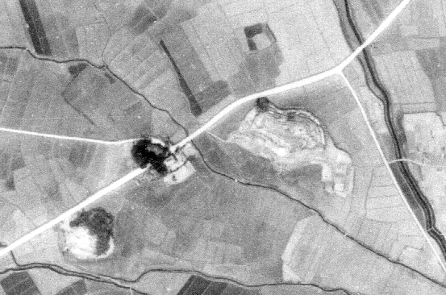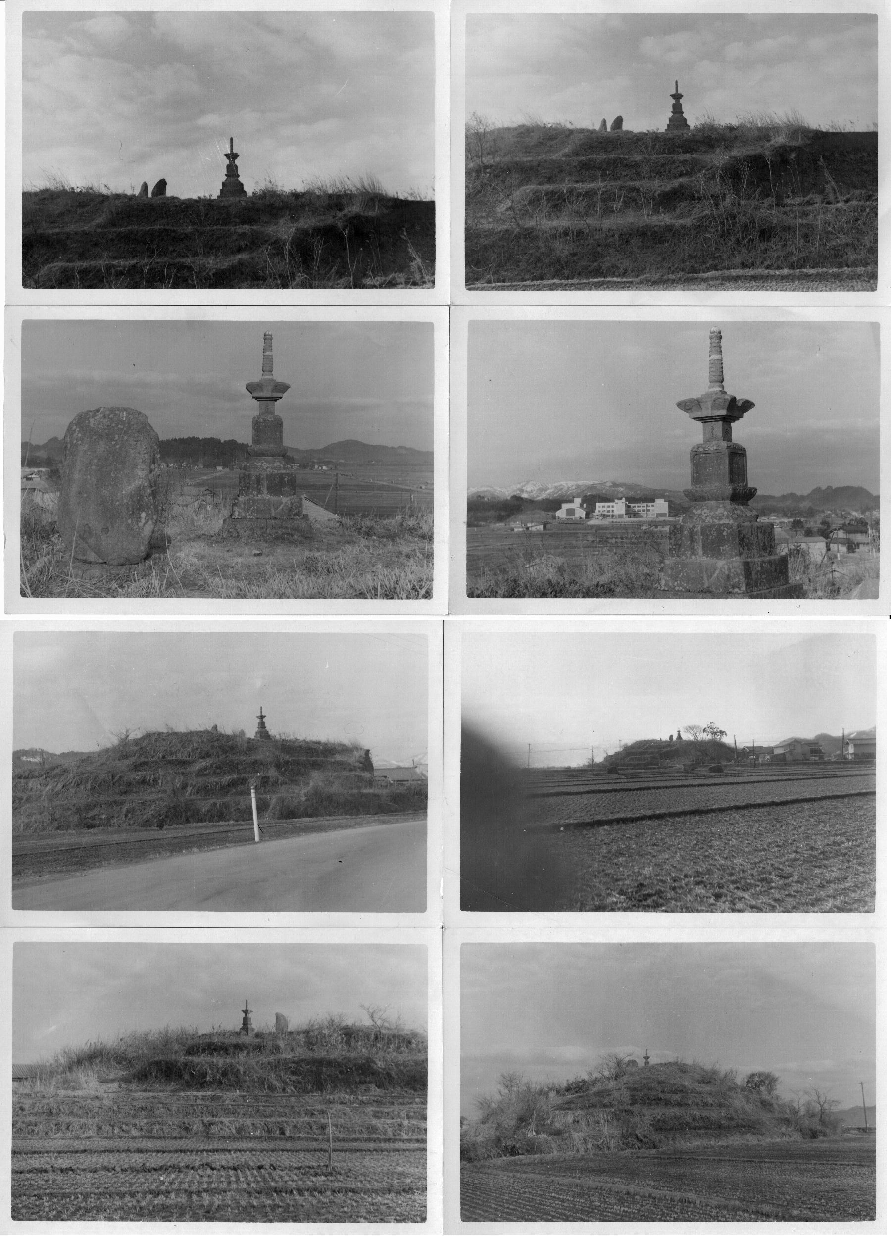 画面中央右寄りの 前方後円墳 形の所が塔の山で墳丘 前方 部分で黒く見えるのが飴嘗地蔵、耕作地にされていたため樹木はこのあたりにしか生えていなく他は禿げ山の状態だった。